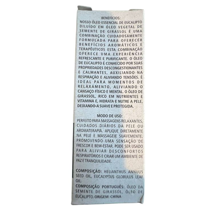 Sinta o poder da natureza em cada gota com o Óleo de Eucalipto Flora Pura 10ml — uma combinação cuidadosamente elaborada de óleo essencial de eucalipto diluído em óleo vegetal de semente de girassol, ideal para proporcionar bem-estar físico e mental.