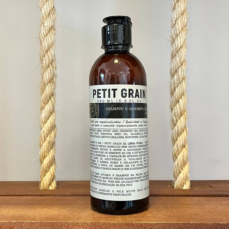 Shampoo 2x1 hidratante Petit Grain, é enriquecido com extratos de calêndula e óleo de semente de uva, fórmula leve e natural que mantém a saúde e a maciez dos fios.